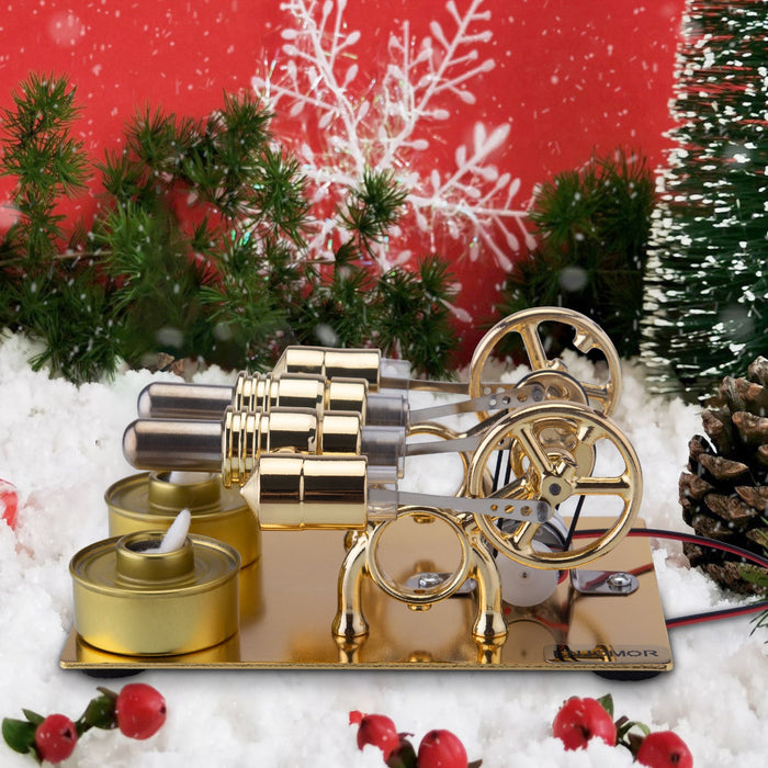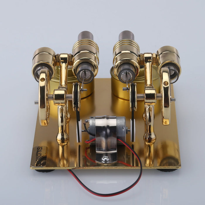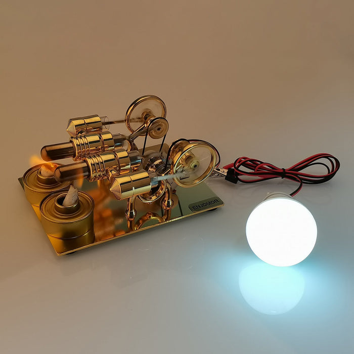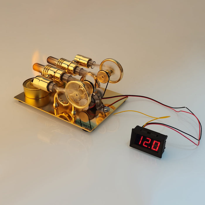 ENJOMOR Golden Paratactic Four Cylinder Hot Air Stirling Engine External Combustion Engine Model Mini Electric Generator to Light Bulb and Voltmeter