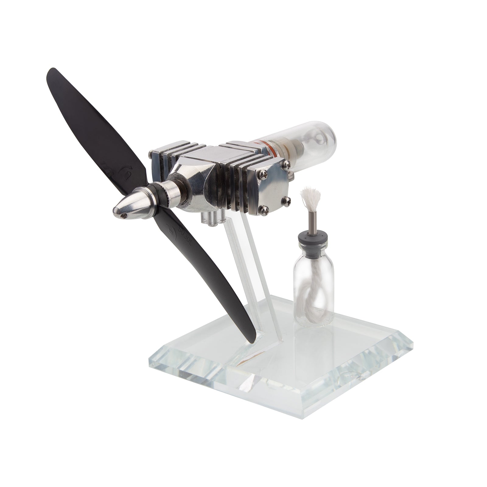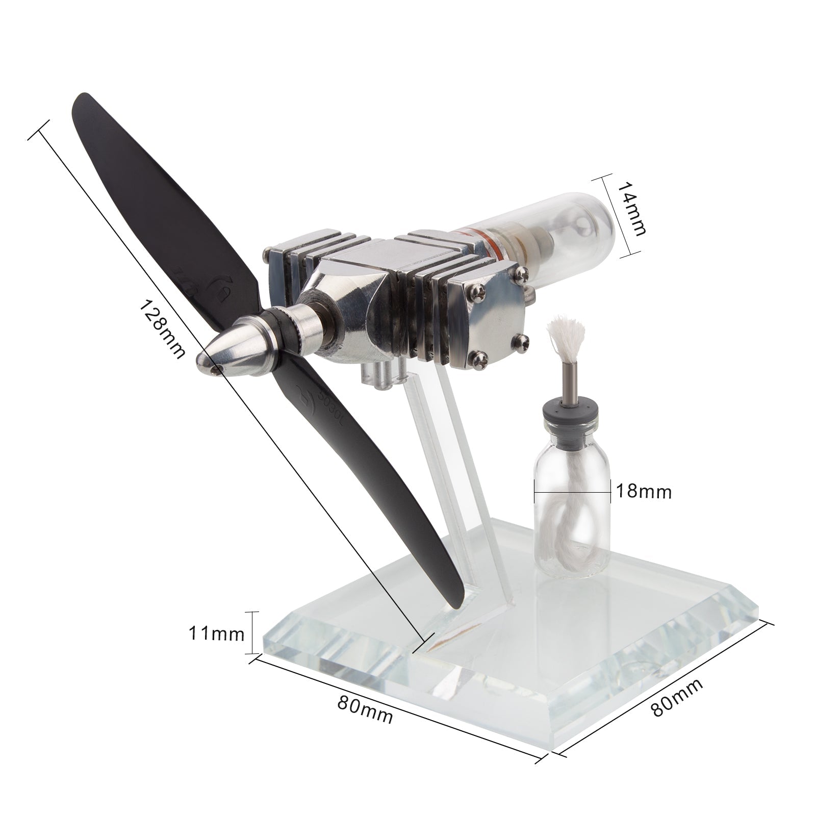 Just heat it up with an alcohol lamp and turn a propeller, and it runs steadily and quickly. You can observe the whole process of the engine.